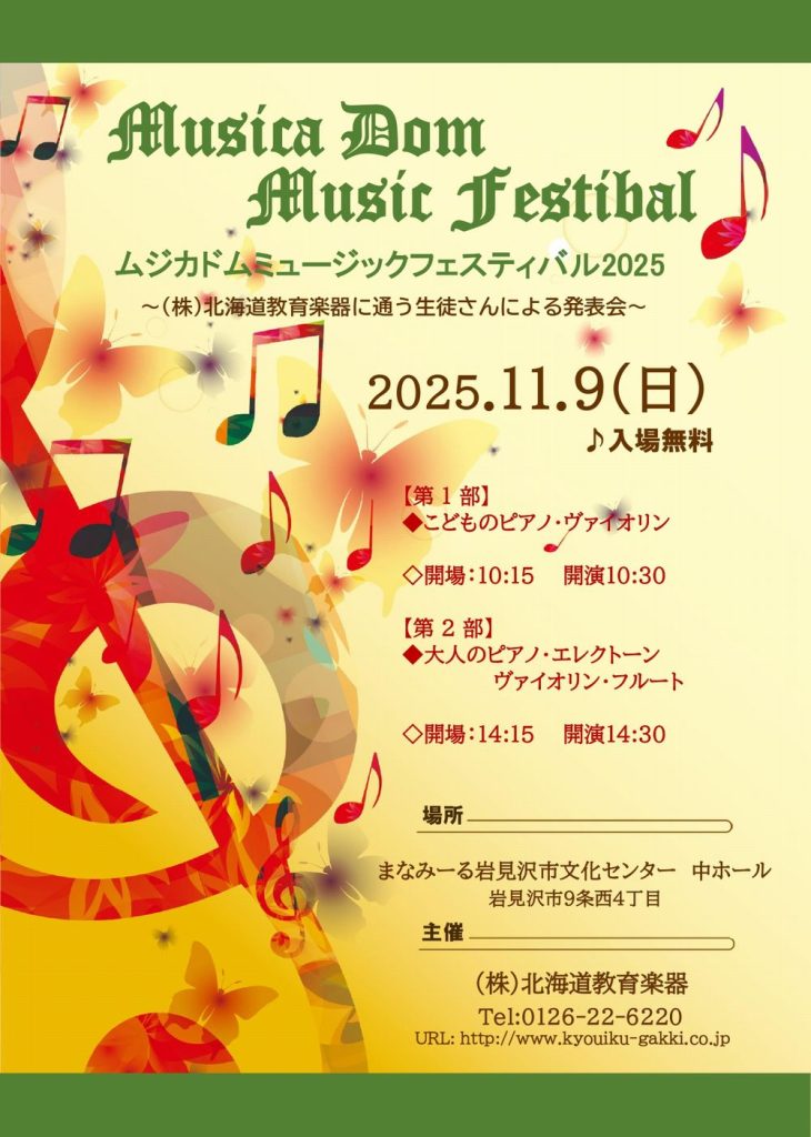 岩見沢イベント情報 ムジカドムミュージックフェスティバル2025~(株)北海道教育楽器に通う生徒さんによる発表会~ 2025年10月6日 ●日時:2025年11月9日(日) 第1部◇開場:10:15 ◇開演:10:30 第2部◇開場:14:15 ◇開演:14:30 ●会場:まなみーる岩見沢市民会館文化センター中ホール(岩見沢市9条西4丁目) ●入場料:無料 ●主催:㈱北海道教育楽器 0126-22-6220 < 前へ 次へ >