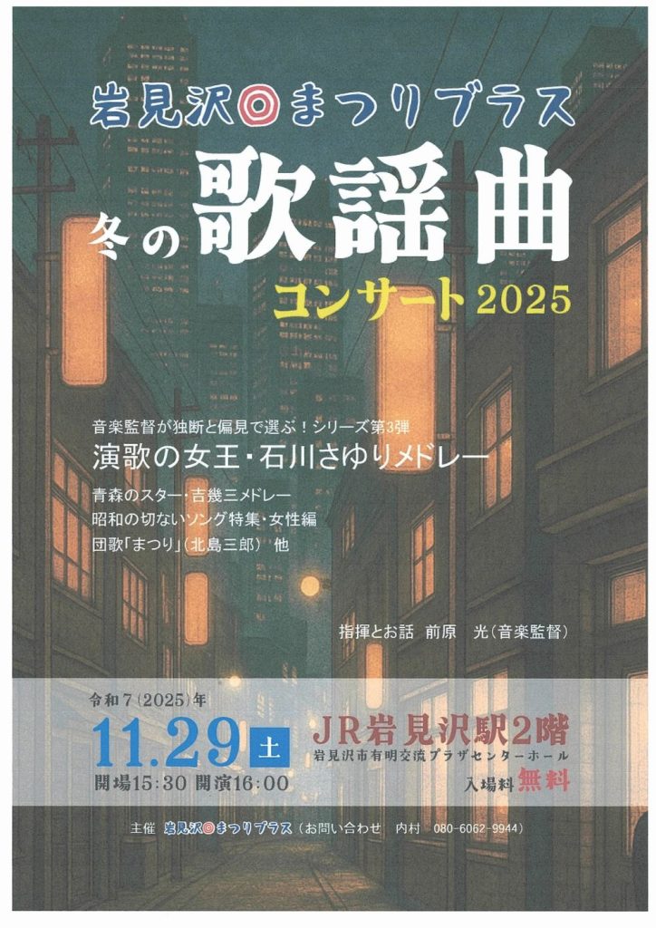 岩見沢イベント情報 岩見沢◎まつりブラス 冬の歌謡曲コンサート 2025 2025年10月29日 ●日時:2025年11月29日(土) ◇開場:15:30 ◇開演:16:00 ●会場:JR岩見沢駅2階(岩見沢市有明交流プラザセンターホール) ●料金:無料 ●お問合せ:080-6062-9944(内村) < 前へ