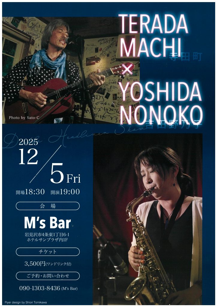 岩見沢イベント情報 寺田町 × 吉田野乃子 2025年12月2日 ●日時:2025年12月5日(金) ◇開場:18:30 ◇開演:19:00●会場:M’s Bar(岩見沢市4条東1丁目6-1 ホテルサンプラザ内1F) ●料金:3,500円(ワンドリンク付) ●ご予約・お問合せ:090-1303-8436(M’s Bar) < 前へ 次へ >