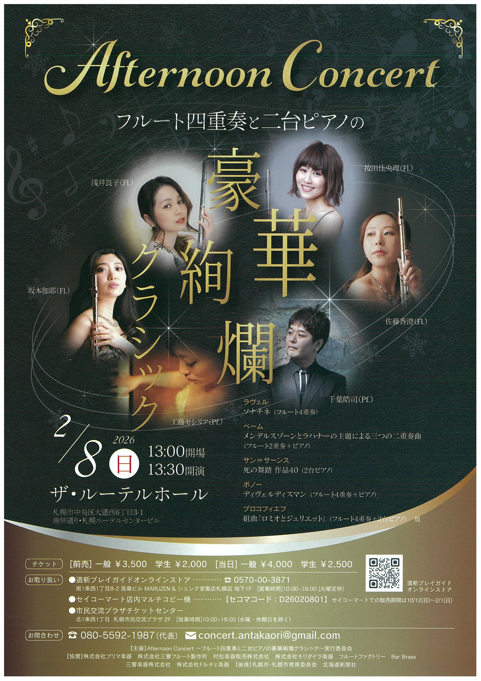 イベント情報札幌 Afternoon Concert フルート四重奏と二台ピアノの豪華絢爛クラシック 2026年1月10日 ●日時:2026年2月8日(日) ◇開場:13:00 ◇開演:13:30 ●場所:ザ・ルーテルホール(札幌市中央区大通西6丁目3-1 南仲通り・札幌ルーテルセンタービル) ●料金:[前売]一般 3,500円 学生 2,000円 [当日]一般 4,000円 学生 2,500円 ●お問合せ:080-5592-1987(代表) concert.antakaori@gmail.com < 前へ 次へ >
