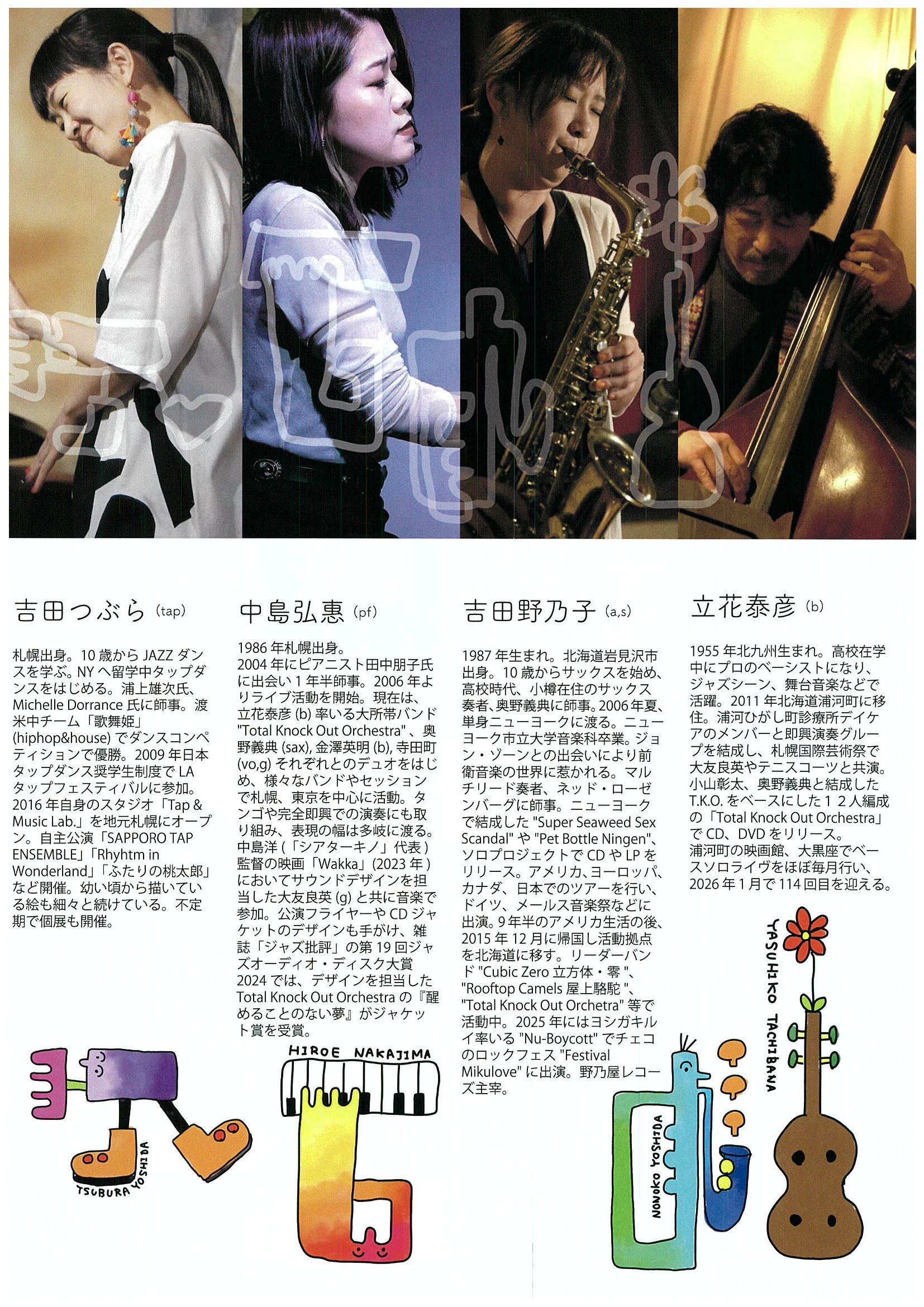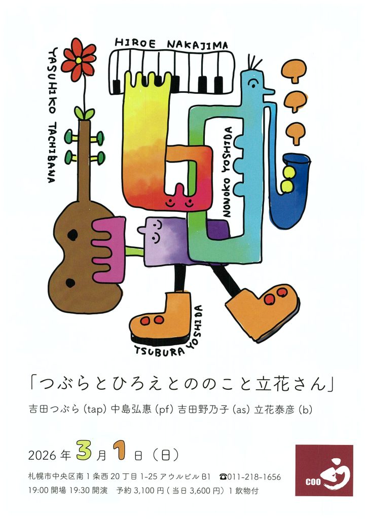 イベント情報札幌 「つぶらとひろえとののこと立花さん」 2026年2月18日 ●日時:2026年3月1日(日) ◇開場:19:00 ◇開演:19:30 ●会場:札幌市中央区南1条西20丁目1-25 アウルビルB1 ●料金:予約 3,100円 当日 3,600円 1飲物付 ●ご予約・お問合せ:011-218-1656 < 前へ 次へ >